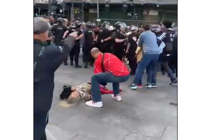 En el video difundido por redes sociales puede verse cómo la mujer se acerca a uno de los uniformados, quien se da vuelta y, casi sin mediar palabra, la empuja violentamente. La jubilada cae desplomada al piso, y queda tendida sin poder moverse por un fuerte golpe en la cabeza.