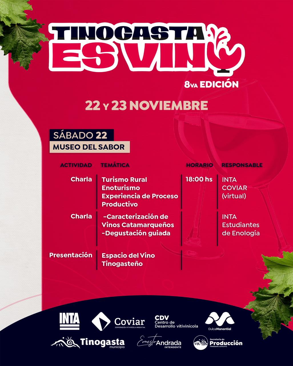 El evento contará con una completa agenda de actividades que incluirá charlas sobre turismo rural y enoturismo, presentaciones sobre el proceso productivo y la caracterización de los vinos catamarqueños, además de degustaciones guiadas y un espacio especial dedicado a destacar la calidad del vino tinogasteño.